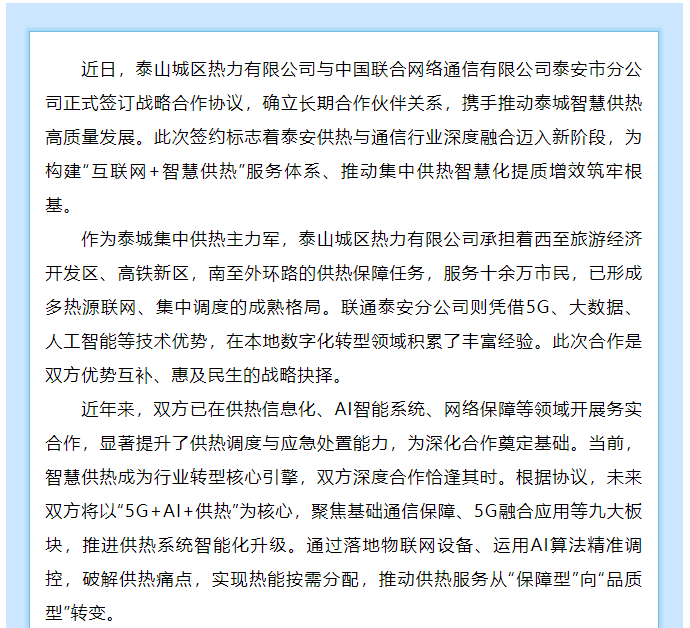 强强联合启新程 数字赋能暖泰城——泰山城区热力有限公司与联通泰安分公司签订战略合作协议