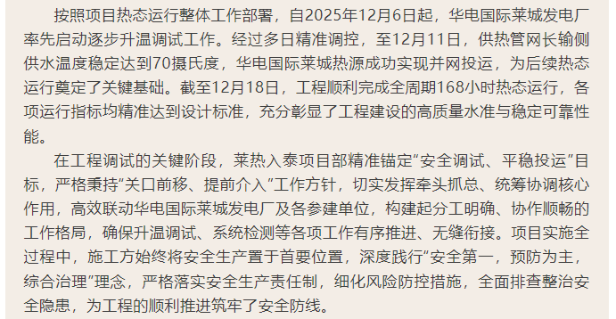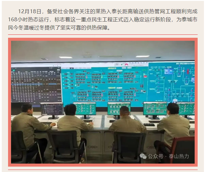 莱热入泰供热管网工程圆满完成168小时热态运行 为泰城今冬供暖筑牢坚实保障