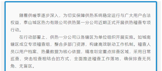 泰山城区热力有限公司供热第一分公司严打违规用热 守护供暖公平